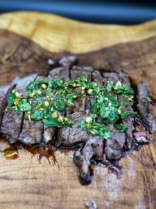 - Snijd de flat iron in plakken tegen de draad en serveer met warme gerookte cowboy boter erover